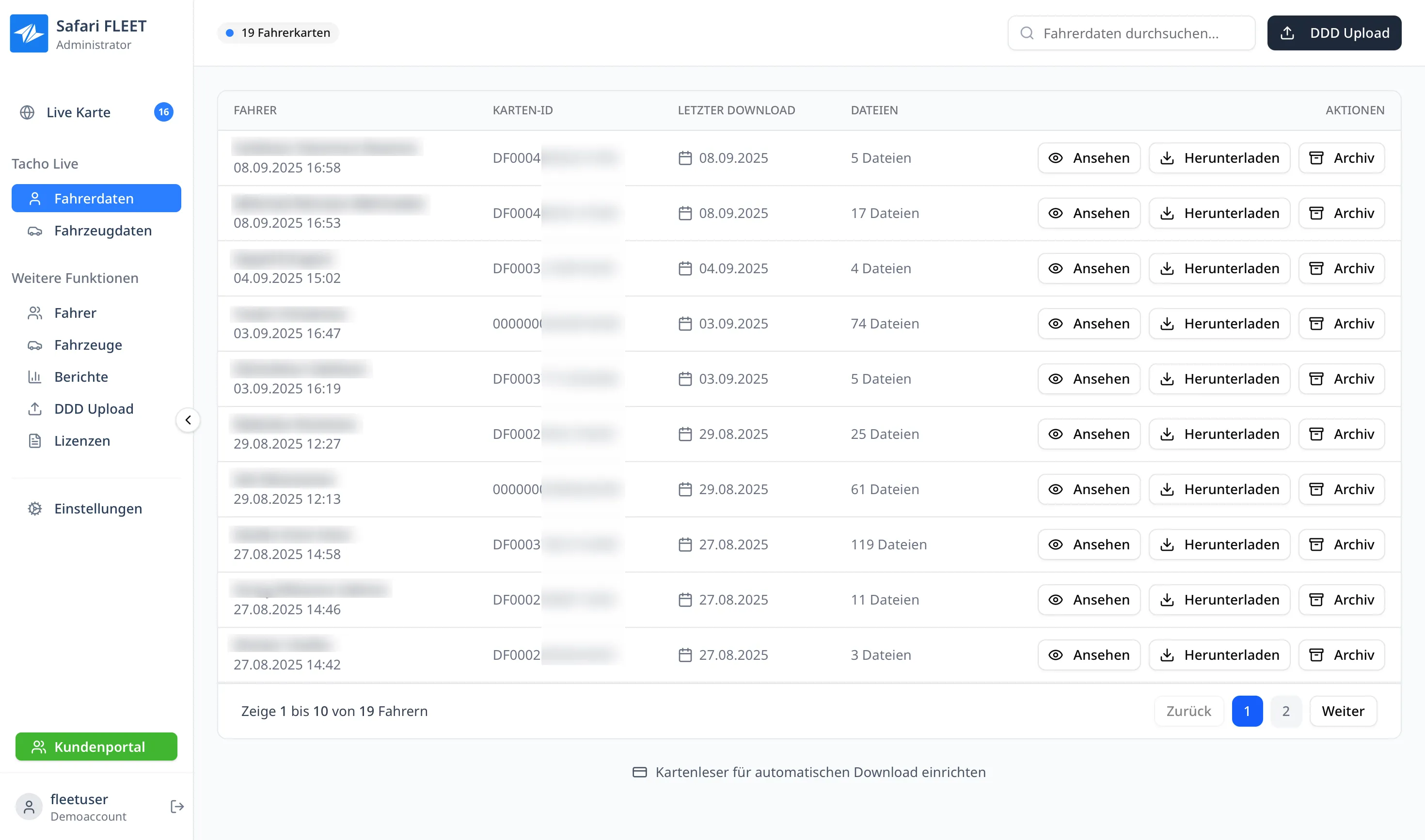 Tägliche und wöchentliche automatische Tachograph-Downloads ohne manuellen Eingriff. Ferngesteuert und zuverlässig für alle Fahrzeuge der Flotte.